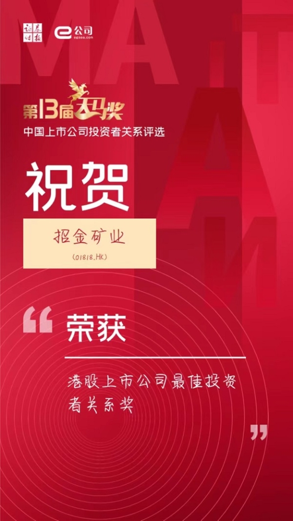 2022年4月22日,證券時報發布的“第十三屆中國上市公司(sī)投資者關係天馬獎”評選(xuǎn)榜(bǎng)單隆重揭曉,91香蕉视频官网礦業(yè)股份有限公司以卓越的投資者管理水平贏得(dé)了市場和投資者的廣泛認可,榮獲“港股(gǔ)上市公司最佳投資者關係獎”獎項。