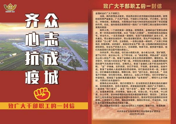 黨(dǎng)委引領,防(fáng)疫生產雙(shuāng)保障。麵對當前的疫情形勢,金(jīn)翅嶺金礦黨委第一時間召開緊急會議(yì)傳達上級(jí)會議精神,全力落實疫情防控的各項要(yào)求。黨政負責人靠前指(zhǐ)揮,帶頭值守,確(què)保疫情防控和安全生產“雙保障”。3月18日,金翅嶺金礦黨委及時(shí)發布《致廣大幹部職工的一封信》、《致廣大幹部職工家屬的一封信》,號召全體黨員幹部提高政(zhèng)治站位,充(chōng)分發揮黨支部戰鬥堡壘作用和黨員(yuán)先鋒模範作用,“疫(yì)”無反顧、共(gòng)克時艱,全(quán)力做好疫情期間安全生產工(gōng)作,確(què)保全年工作目標(biāo)任務圓滿(mǎn)完成。