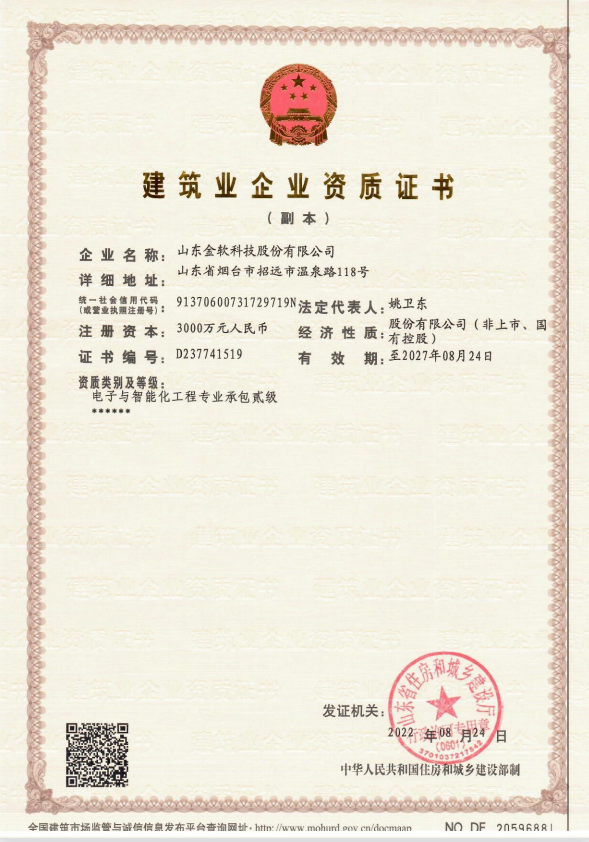 近日,經山東省住房和城鄉建設廳批準,山東金軟科技股份有限公司順利取得“電子(zǐ)與智能化施工貳級資(zī)質”,此資質的取得(dé)進一步驗證了金軟科技近年來(lái)在專業人(rén)才隊伍建設、經營管理(lǐ)體係(xì)優化改進、項目實施及(jí)技術服務能力提升等方麵取得(dé)的業績,同時也標誌著(zhe)金軟科技(jì)在規模(mó)化、合規化經營發展方麵邁入了新的曆史性台階(jiē),企(qǐ)業的行業競爭力獲得了(le)大幅提升。