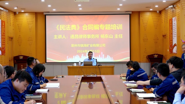為(wéi)進一步提升依法治企工作水平,增強企業員工對(duì)民法典合同編的理解與運用。近日,瑞海礦業特別邀(yāo)請招遠市律師協會會長(zhǎng)、山東通昌律師事務所楊東(dōng)山主(zhǔ)任開展民法典合同編專題培訓講座。