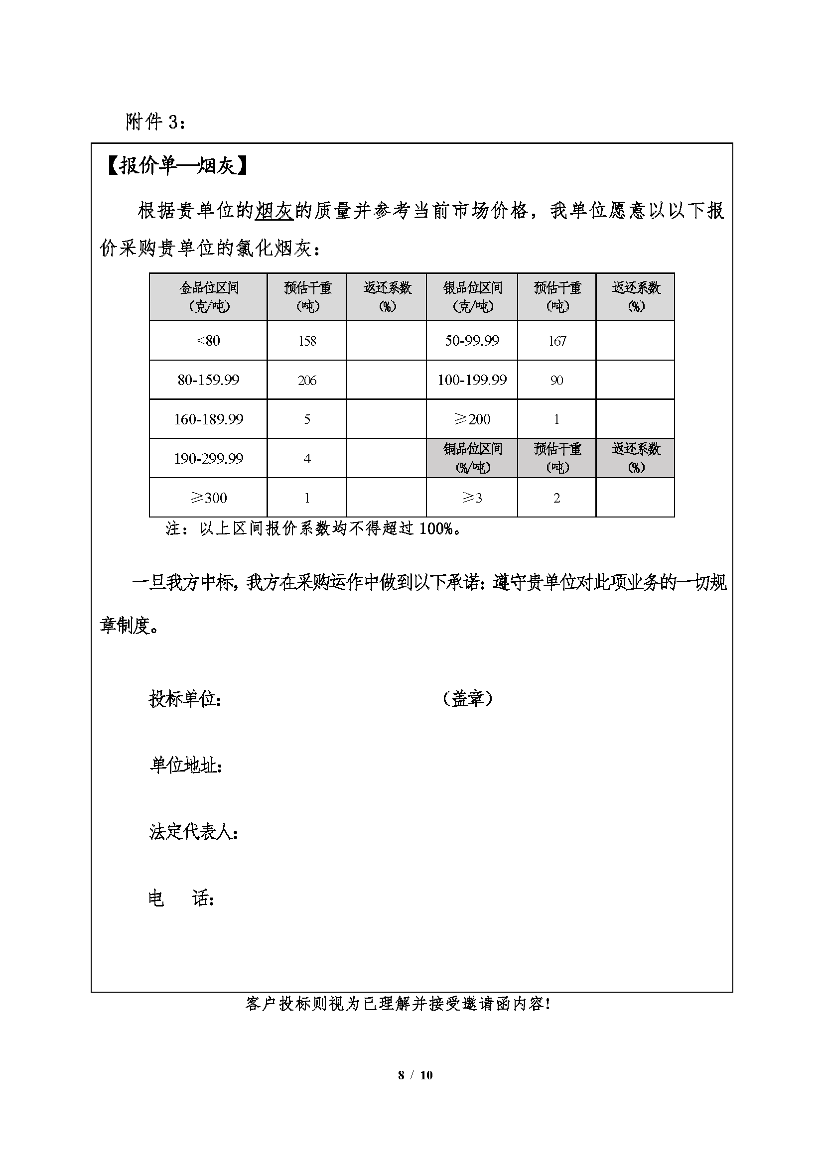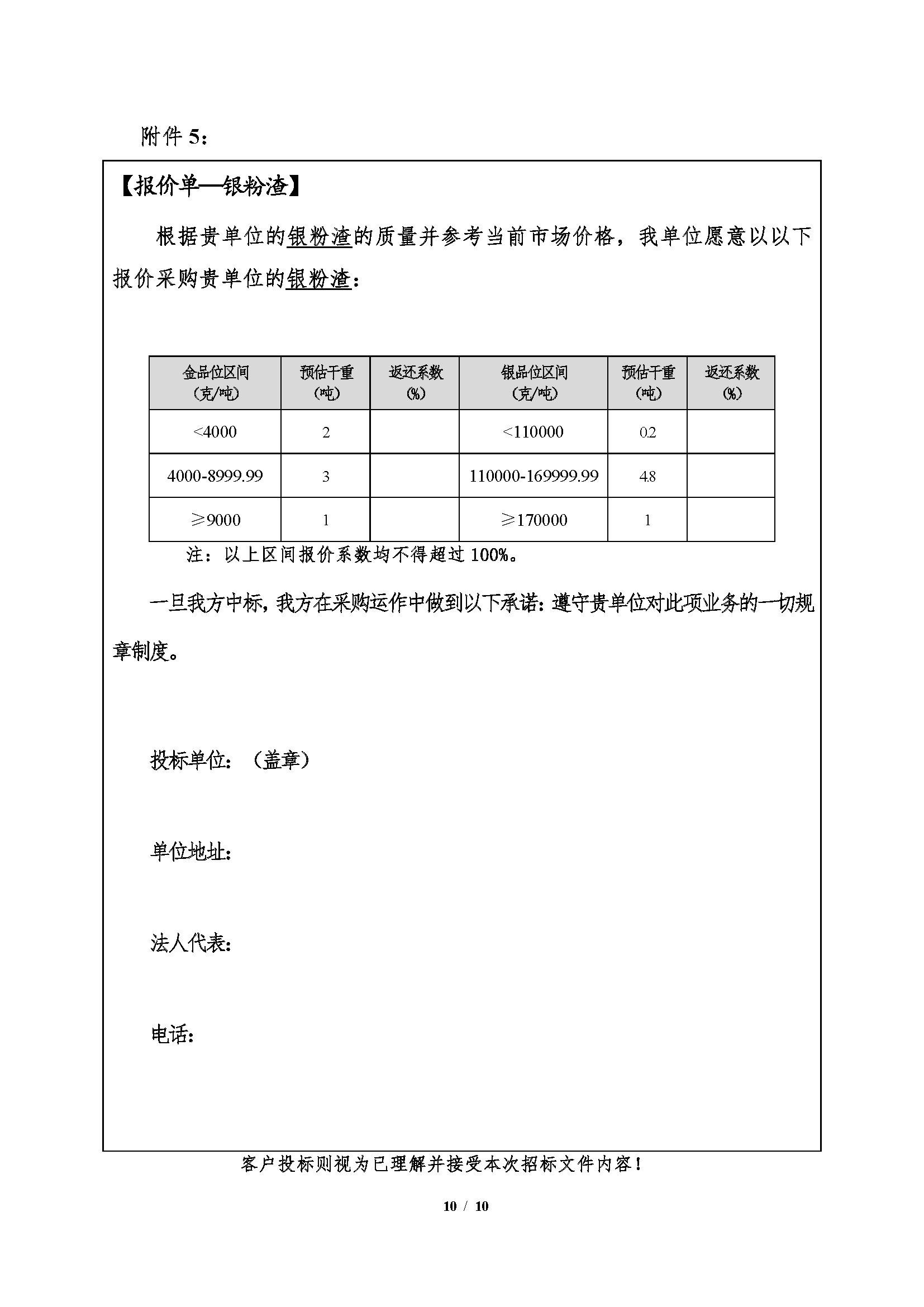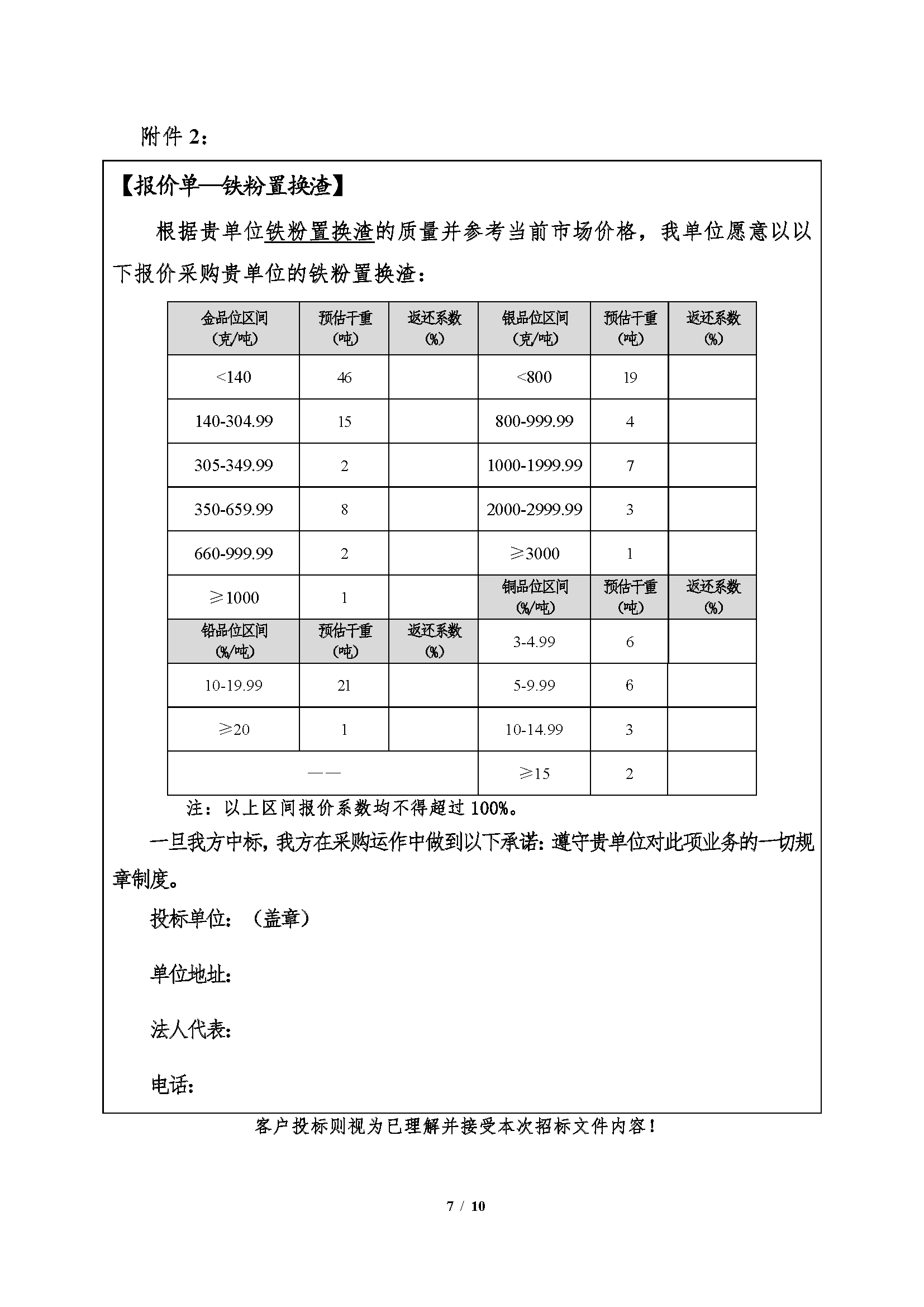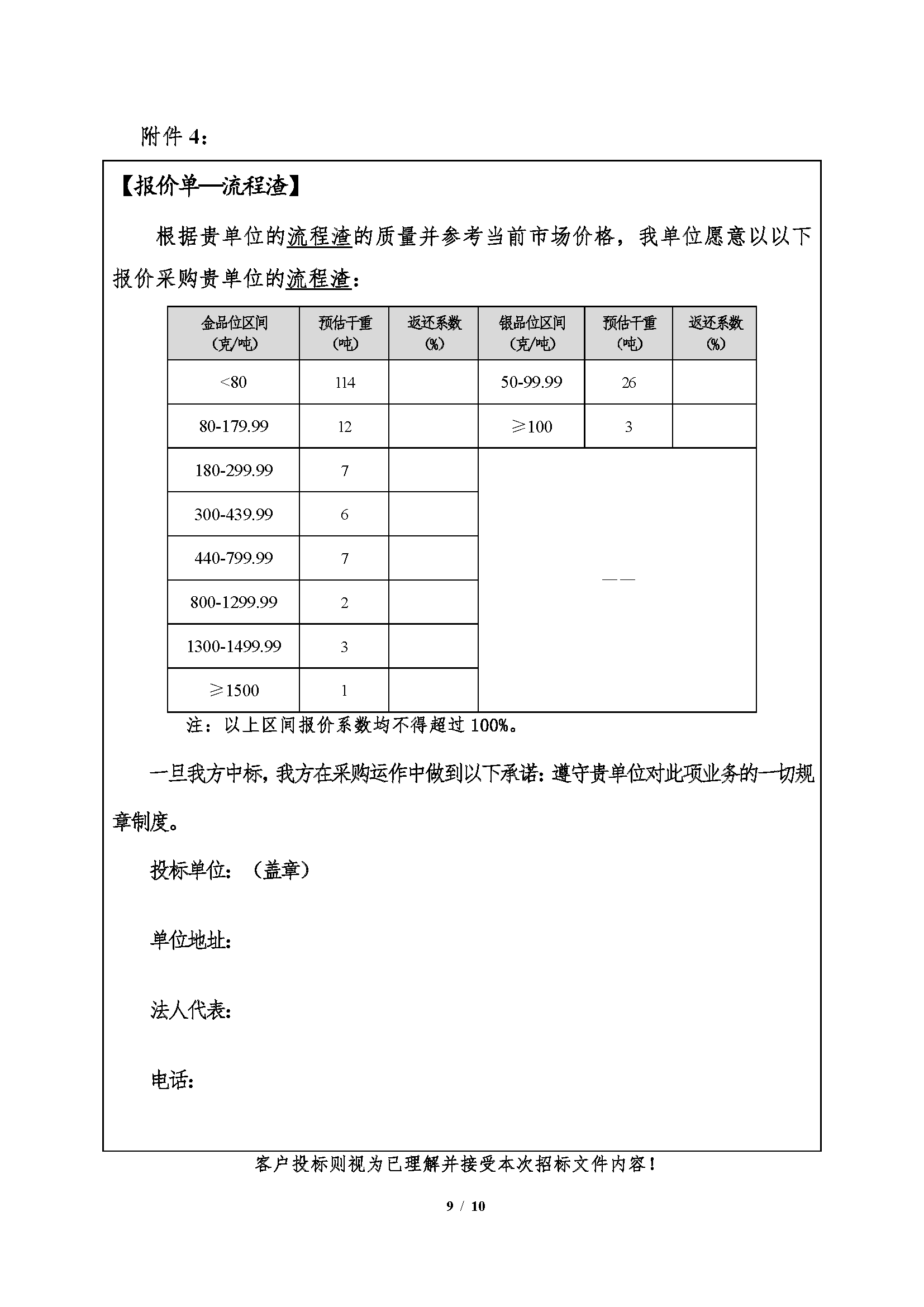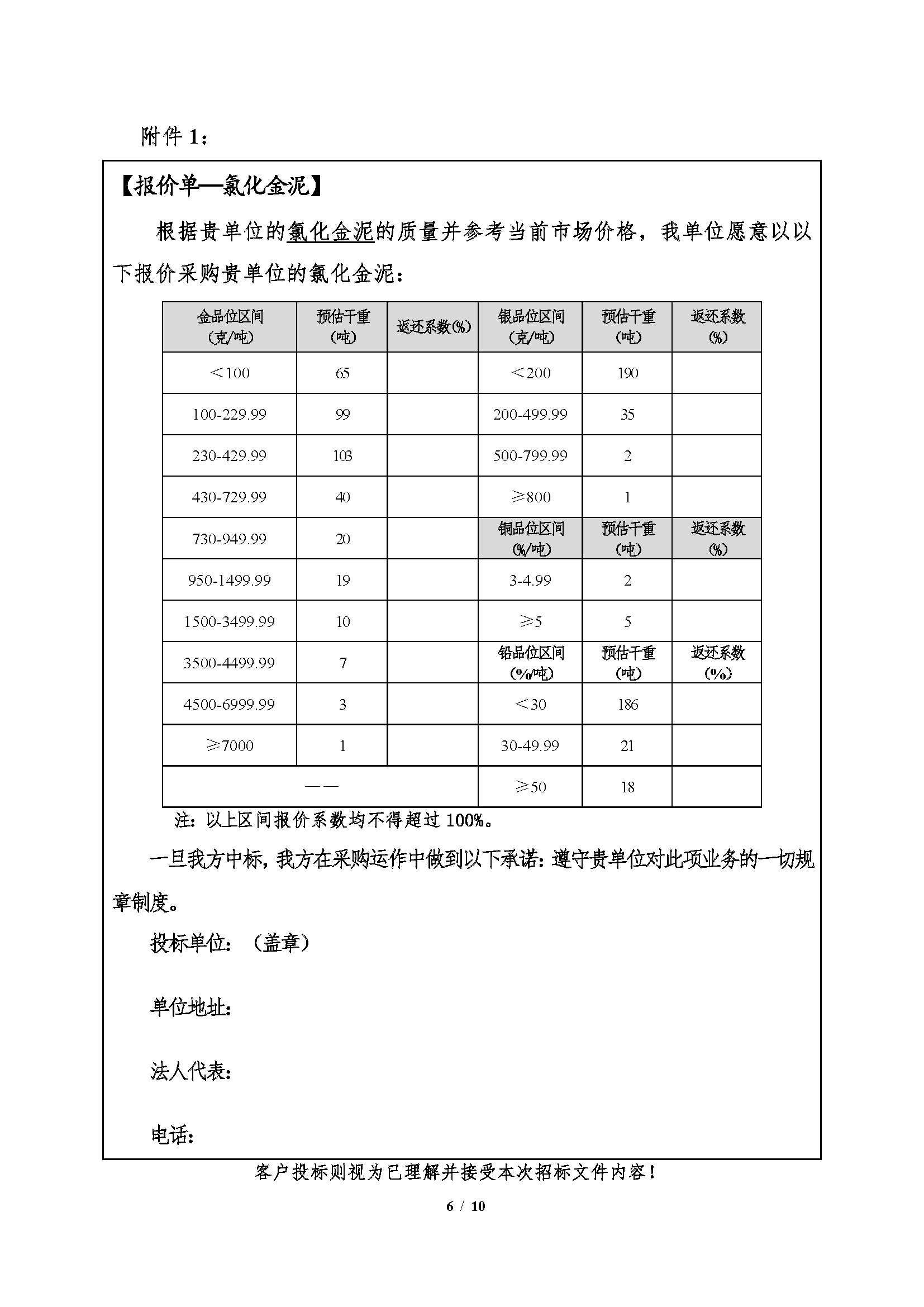 注:1、氯化金泥、鐵粉置換渣、煙灰、流程渣為捆綁銷售,以四種產品(pǐn)的合計(jì)綜合價值確定中標單位,單項投標(biāo)視(shì)為棄標;銀粉渣按照其綜合價值單獨中標。