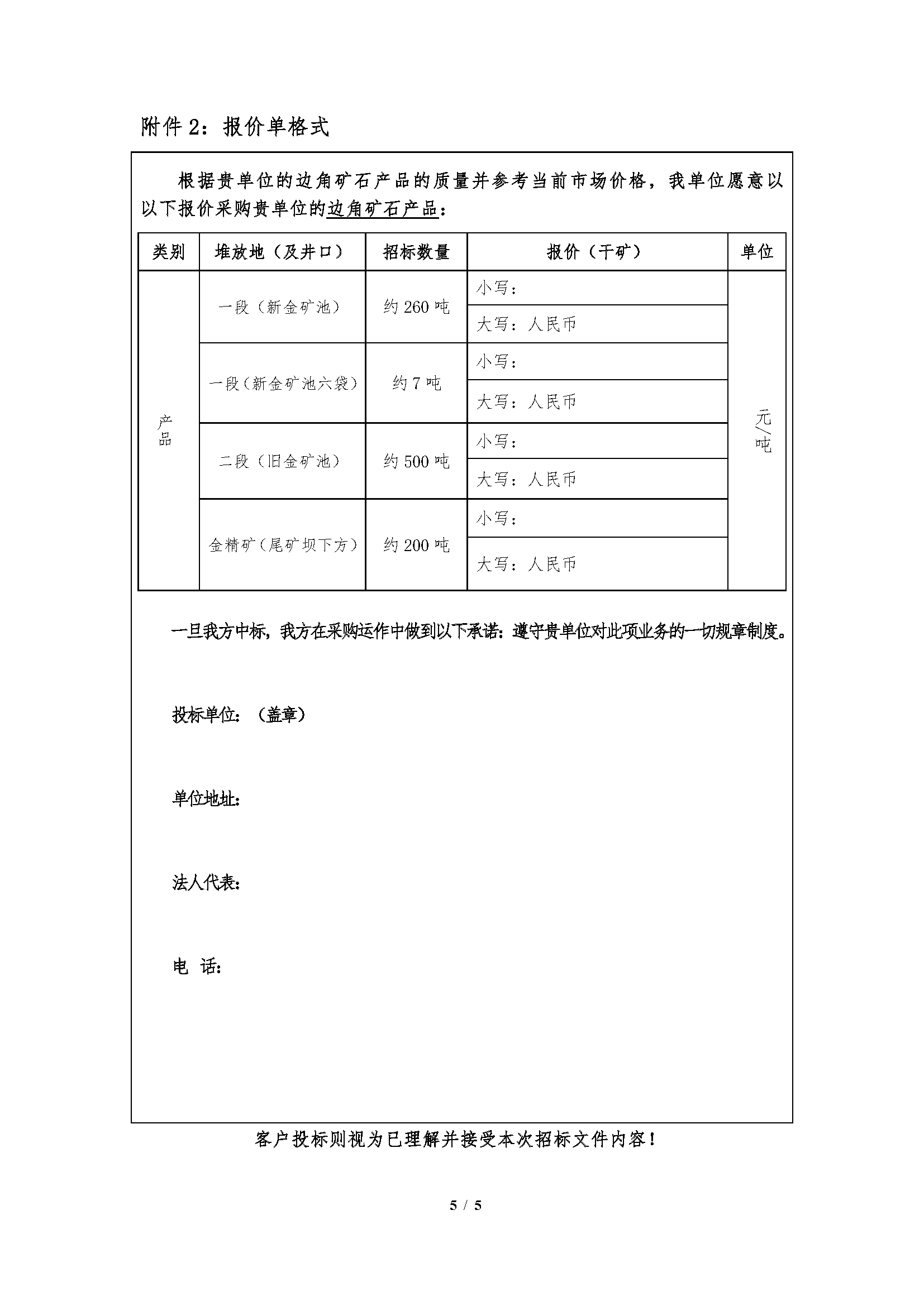 本次招標產品為我公司邊角礦石及產品。投標人需提供“三證合一”的營業執照複印件(jiàn)、法人(rén)授權委托書(原件)並加蓋企業公章,於2023年12月11日 12: 00 前將上述材料送交甘肅省合作早子溝金礦有限責(zé)任公司(sī)人力資源法務(wù)人員進(jìn)行審核,審核合(hé)格後的單位應於12月12日11:00前交納投標保證金(見下表,保證金須以轉賬方式支付)。投標保證(zhèng)金(jīn)交納金額與我公司招標文件要求不符的、投標保證金未及時到賬的(de)視為廢(fèi)標。若投標人最終未中標,則由(yóu)投標人(rén)開具收款收據後,我公司將一次性無息退還投標保證金。