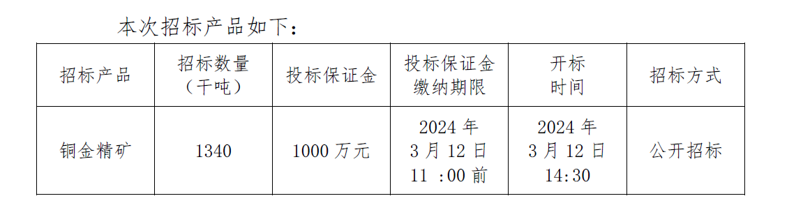 本次(cì)招標產品為我公司銅金精礦。投標人需提(tí)供“三證合一”的營業執照複印件(個人提供身份證複印件)、法人身份證複印件、法人授權委托書(原件)、被授權人身份證複印件,並加蓋企業公(gōng)章,於2024年3月11日11:00前將上述(shù)材料送交我公司財務科進行審核,審核合格後的(de)單位應於2024年3月12日11 :00前交(jiāo)納投標保證(zhèng)金(見下表,保證金須以轉賬方式支付)。投標保證金交納金(jīn)額(é)與我公(gōng)司招標文件(jiàn)要求(qiú)不符的、投標保證金未(wèi)及時到賬的視為廢(棄)標。若投標人最終未中標,則由投標人開具收款收(shōu)據(jù)後,我(wǒ)公司將一(yī)次性無息退還投標保證(zhèng)金。