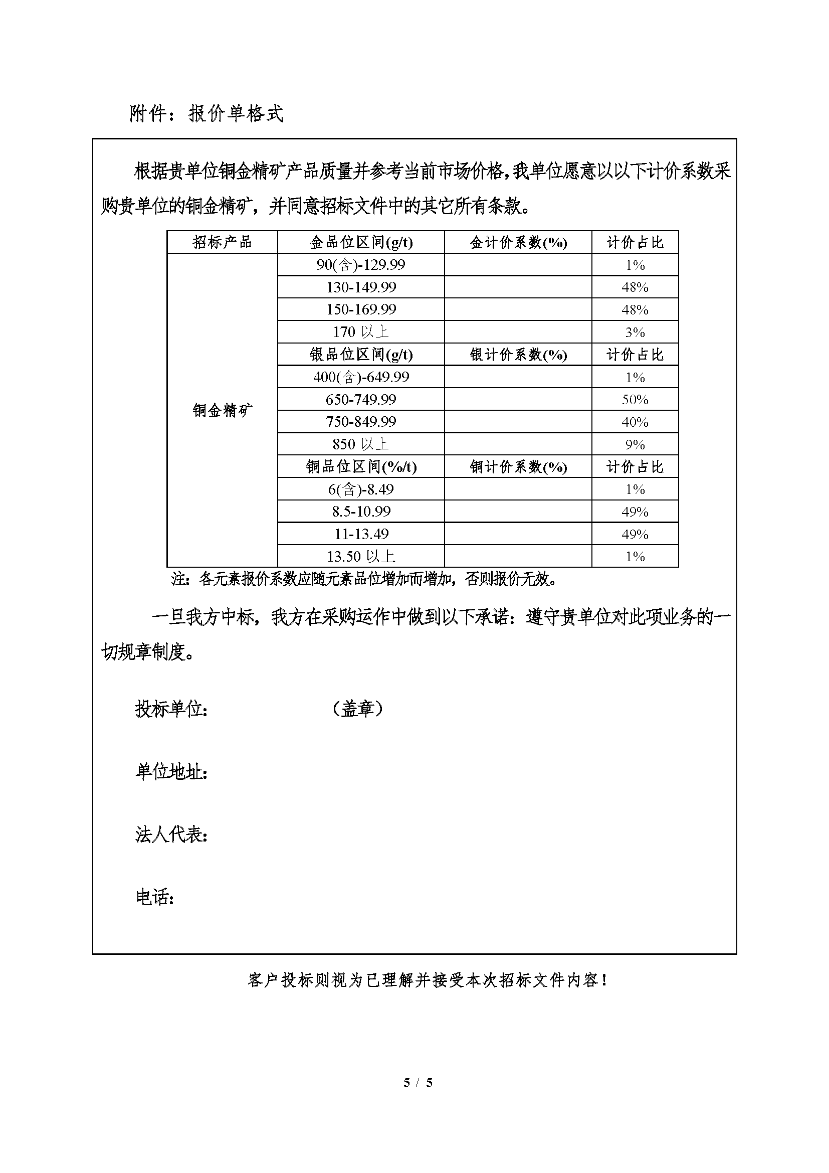 報價測算時金、銀、銅的基(jī)準品位按照各區間中間值(zhí)計算,無中間(jiān)值取邊界(jiè)值(例如90-129.99,取110;170以上,取170),產品報價按噸礦綜合價值最高(gāo)且(qiě)高(gāo)於(yú)底標的單位中標。報價全部低於底(dǐ)標為流標,開標時符合投標要求的投標人少於三家則為(wéi)流標;若投標人中標後放棄中標(biāo)資格的,我公司扣留全額投(tóu)標保(bǎo)證金,不予退回(huí)。