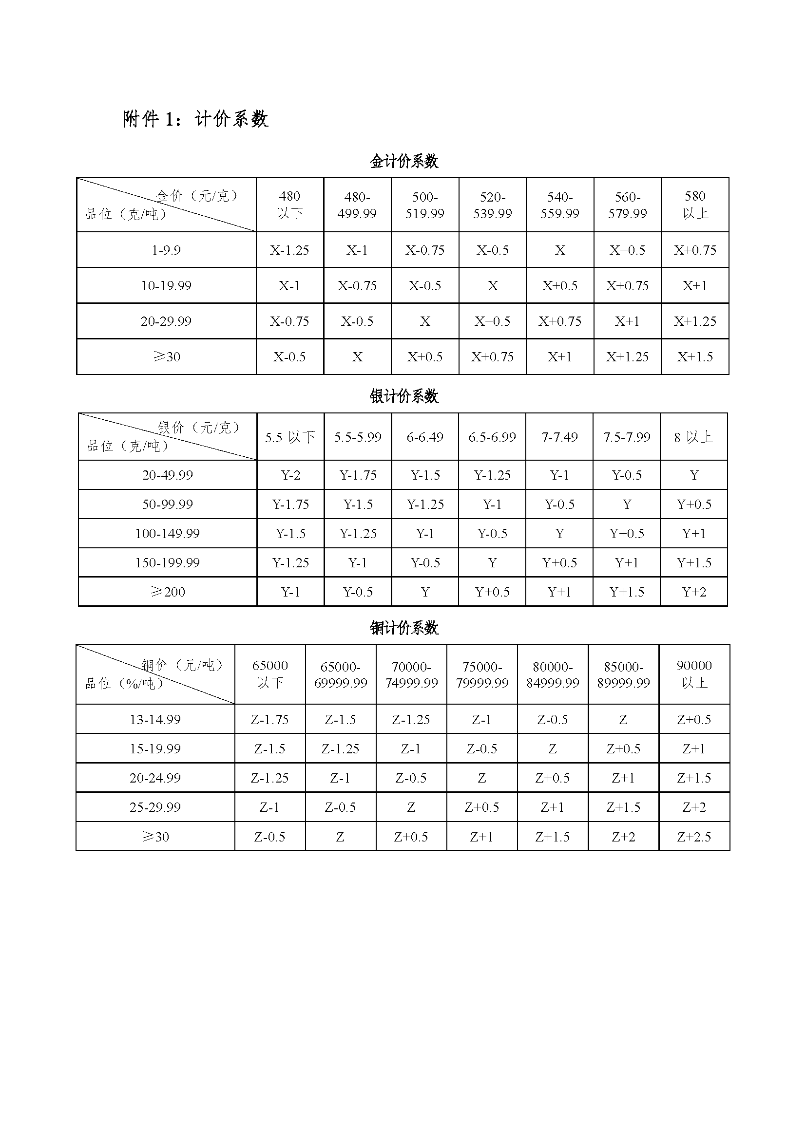 基準報價係數不得超過99%。其中金品(pǐn)位≥1克/噸計價,銀品(pǐn)位(wèi)≥20克/噸計價,銅含量≥13%進行計價(jià)。