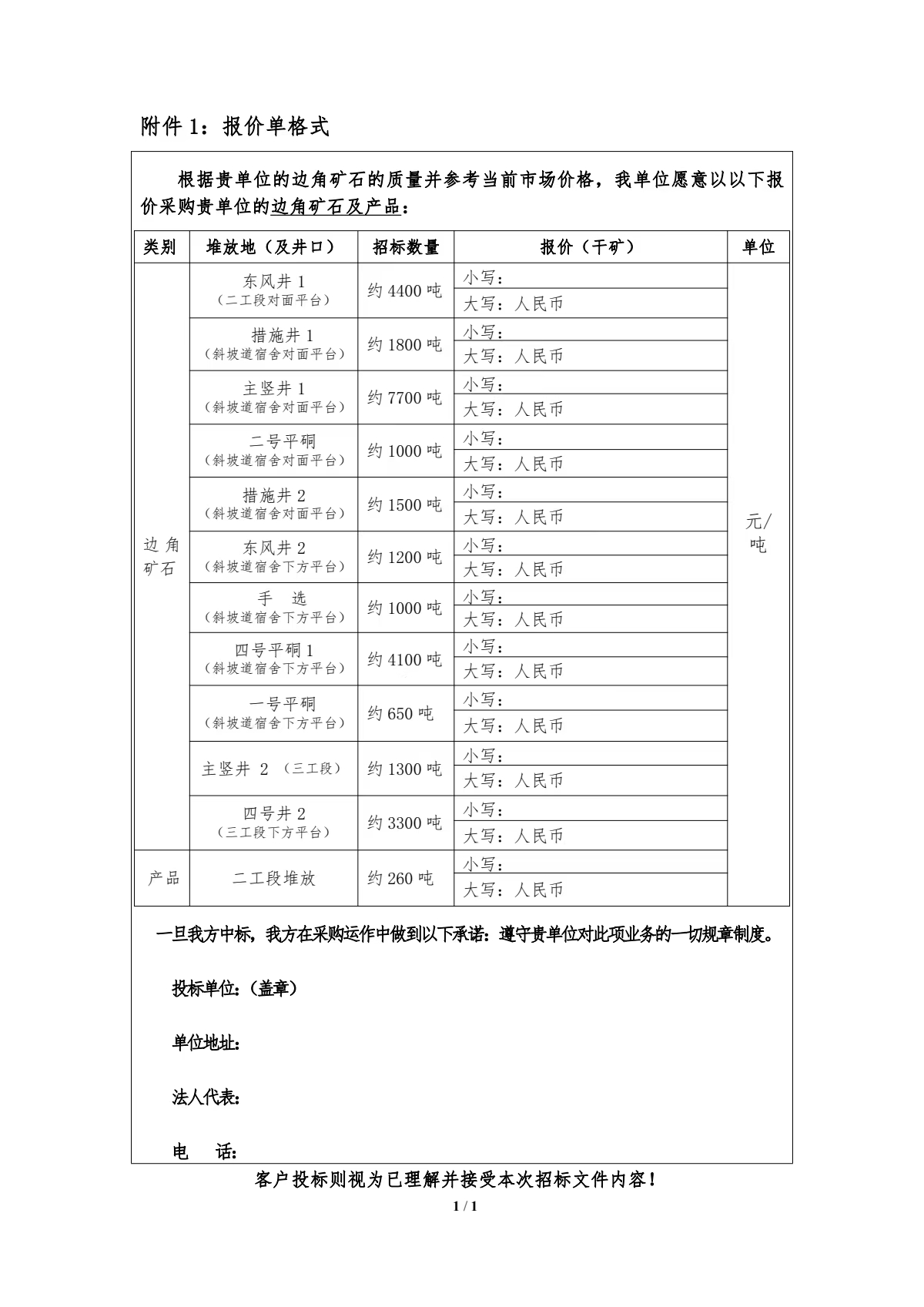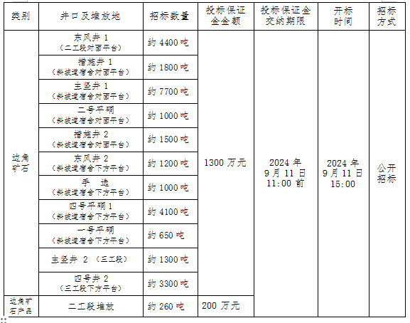 注:本次招標產品(pǐn)數量為預估數,投標按幹礦報價,中標結算濕礦以實際過磅數為準,水(shuǐ)分按2%扣除計算幹礦;邊角(jiǎo)礦石產品水分由中標人(rén)及我公司相關科室、車間人員現場取樣、我公司化驗的水分數(shù)據為準。如中標(biāo)人需要,我公司開具甘肅省增值稅普通發票(黃金)。