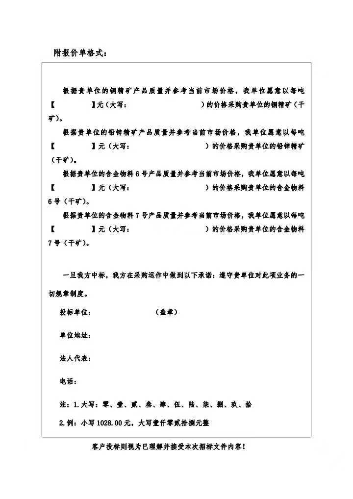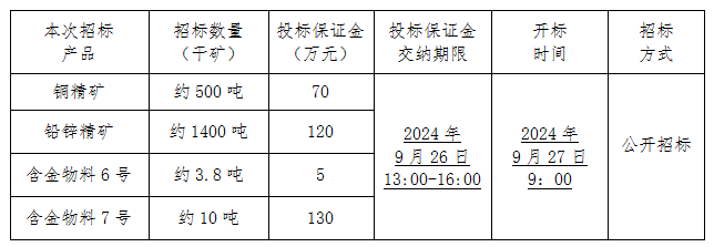 本次招標副產品為我公司銅精礦、鉛鋅精礦、含金物料。投(tóu)標人需提供“三證合一”的營業執照複印件(個人(rén)提供身份證複印件)、法人授權委托書(原件)並加蓋企業公(gōng)章,於2024年9月25日16:00前將(jiāng)上述(shù)材料送交我公司企管審計科進行審核,審核合格後的單(dān)位應於2024年9月(yuè)26日下午13時-16時交納投標保證金(見下表,保證金須以轉賬方式支付)。如在2024年9月26日下午16時前投(tóu)標保證金未足額匯入我公司(sī)賬戶則視為放棄本次(cì)投標;若投標(biāo)人(rén)最終(zhōng)未中標,則由投標(biāo)人開具收款收據後(hòu),我公司將一次(cì)性無息(xī)退還投標保證(zhèng)金。